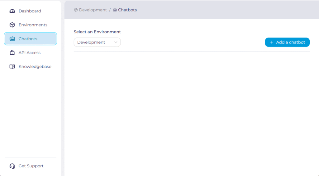 Fist, let’s start with the prerequisites – all chatbots exist inside of an Environment. For more information on environments and how to create them, please read our environments article. Once you have an environment to create the chatbot in, you can use the lefthand navigation to go to the Chatbots page.