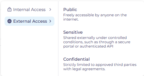 - Next, select the sensitivity of the dataset. This can be a number of different options depending on both who should be able to access the information and under what circumstances. For example, customer’s Personally Identifiable Information would be accessible externally (as the customer doesn’t work for the company) but still as Confidential information that only they have access to. The options are below.