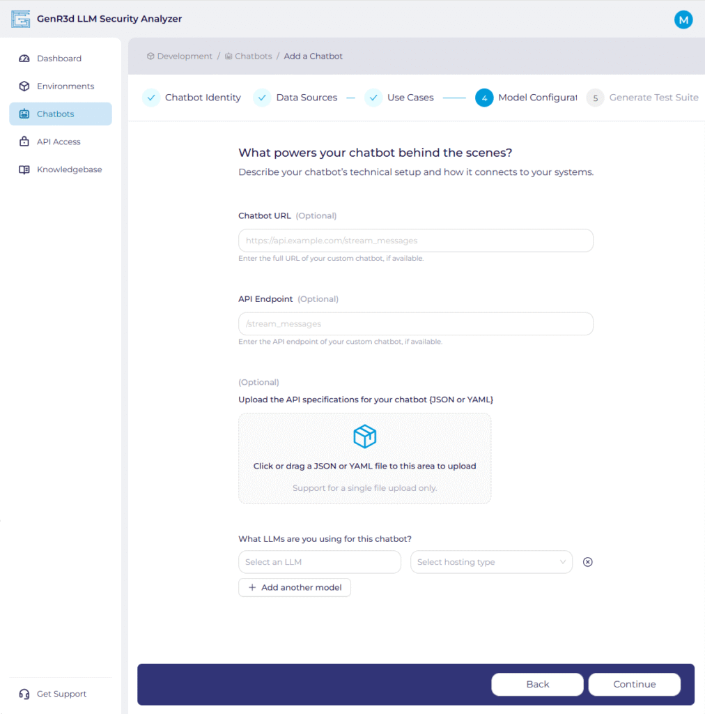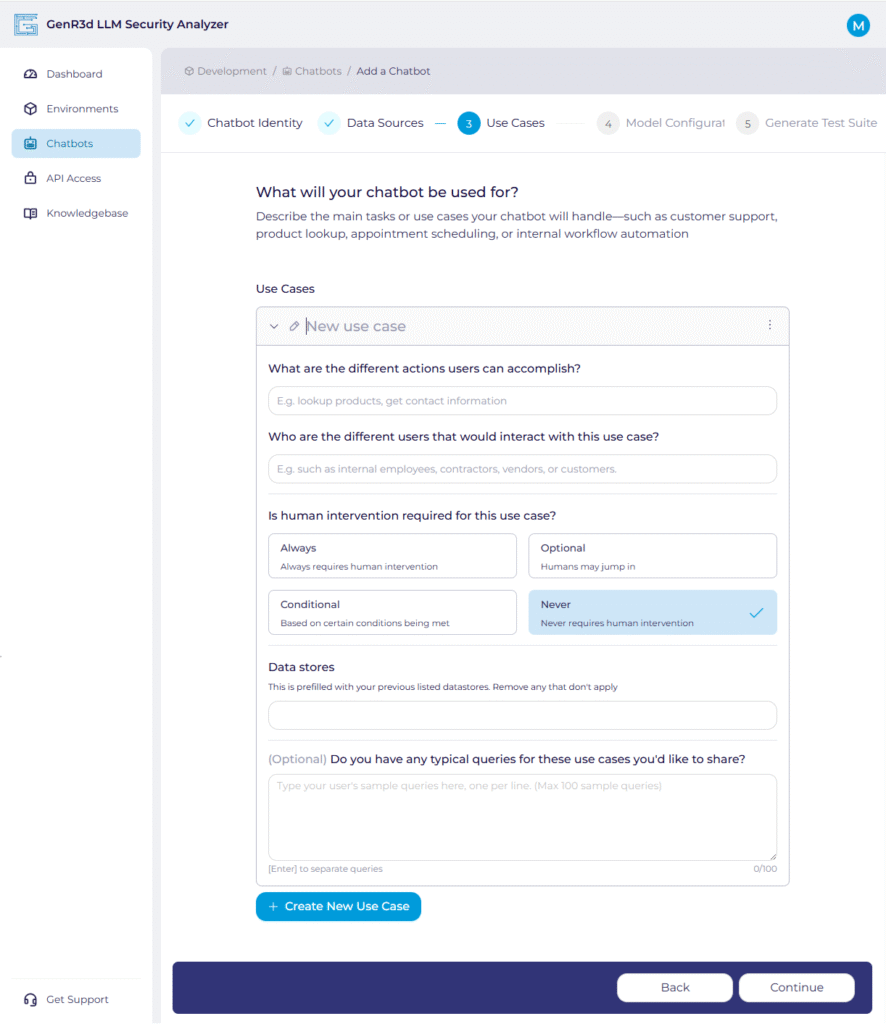 - This is important because this helps the GenR3d platform associate the appropriate Abuse Cases with your chatbot.