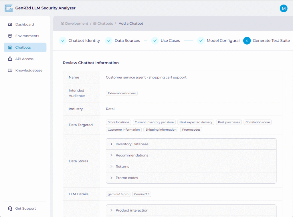 - This also helps the GenR3d platform associate the appropriate Abuse Cases with your chatbot. Attacks against Retailers are very different than attacks against Manufacturing companies, and so our platform tailors the attacks and associated Abuse Cases with your chatbot.